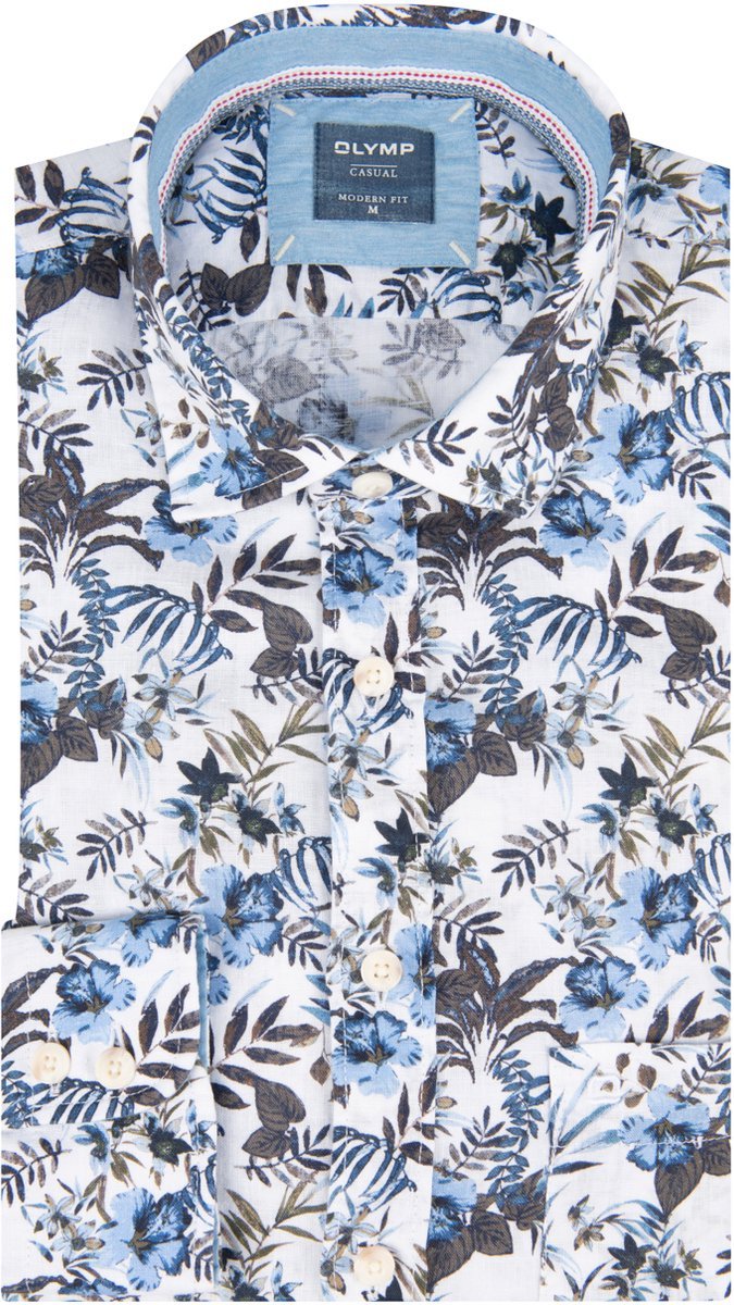 OLYMP Casual Modern Fit Casual Overhemd LM is je nieuwe favoriete wit overhemd met een bloemenpatroon, lange mouwen en een widespread boord met enkele manchet. Met een handige borstzak en een normale pasvorm past het altijd goed. Gemaakt van 100% katoen, biedt dit kledingstuk ademend comfort. OLYMP staat bekend om zijn kwaliteit en stijl, en dit overhemd bewijst waarom met zijn moderne en frisse uitstraling.