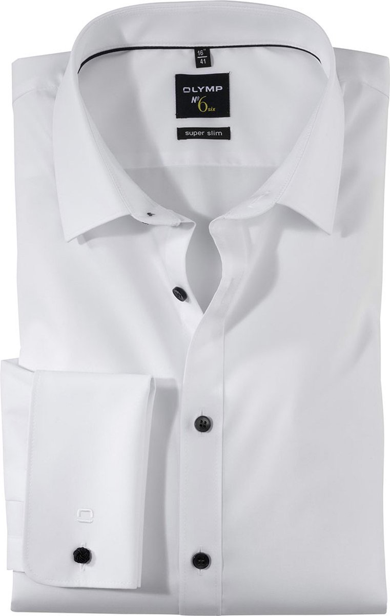 OLYMP No. Six super slim fit overhemd – dubbele manchet – wit met zwarte knoopjes – Strijkvriendelijk – Boordmaat: 43